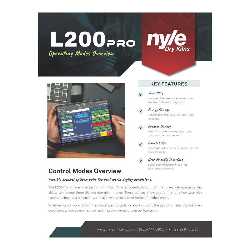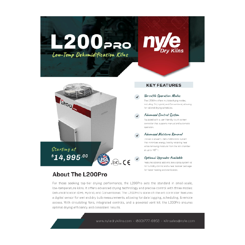 The L200PRO is a revolutionary, high-performance dry kiln system. It will dry approximately 4000 board feet of 4/4 green oak in 4-5 weeks. It will dry 1500 to 2500 board feet of green softwood in about 1-2 weeks.